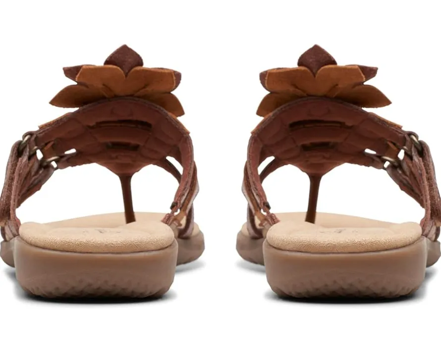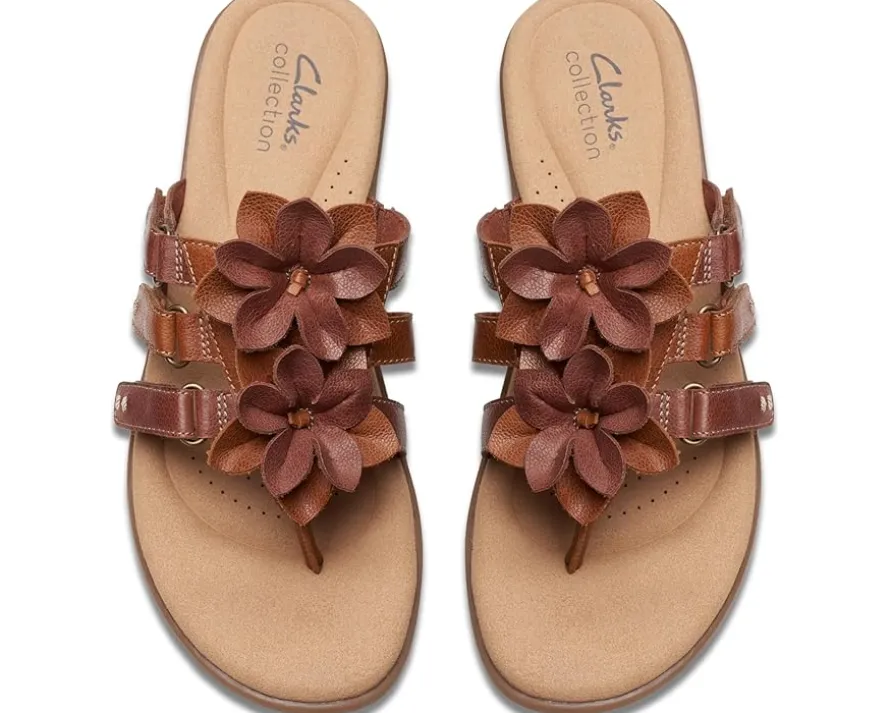 - Crafted with a leather upper with cut-out flower detailing, the Clarks™ Elizabelle Mae sandals offer a chic look. Offering superior comfort and style, the padded rubber footbed and mesh lining take your comfort to the next level. Easy to slip on and off, these toe-post style sandals feature a hook-and-loop strap closure that offers a custom fit. Flaunt your great style by wearing these stylish sandals.