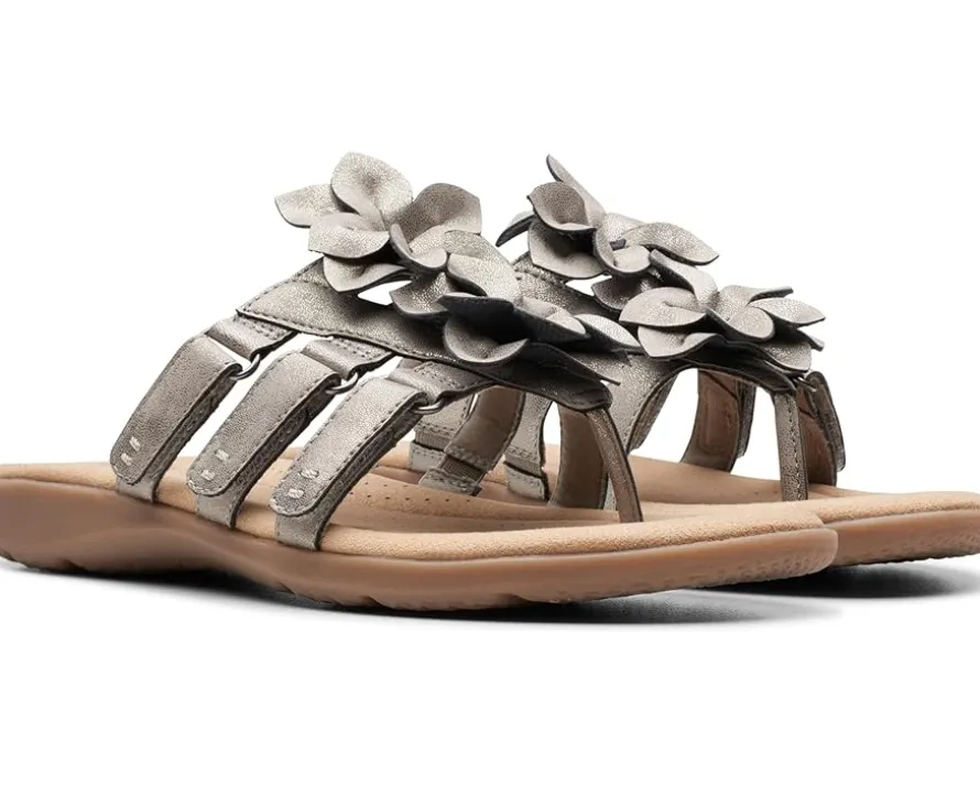 - Crafted with a leather upper with cut-out flower detailing, the Clarks™ Elizabelle Mae sandals offer a chic look. Offering superior comfort and style, the padded rubber footbed and mesh lining take your comfort to the next level. Easy to slip on and off, these toe-post style sandals feature a hook-and-loop strap closure that offers a custom fit. Flaunt your great style by wearing these stylish sandals.