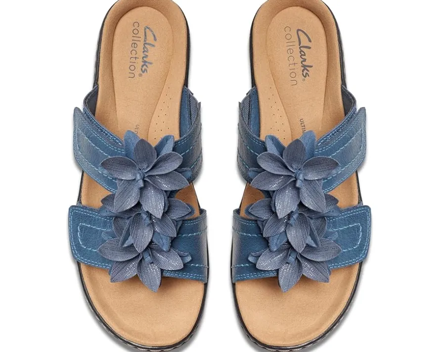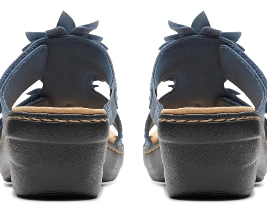 - Look exquisite from head to toe by pairing your smart dress with the comfy Clarks™ Merliah Raelyn. Crafted from leather upper, synthetic lining, and ultimate comfort foam footbed, this pair of sandals features floral details on the upper, open round toe silhouette, hook-and-loop strap closure, and wedge heels.