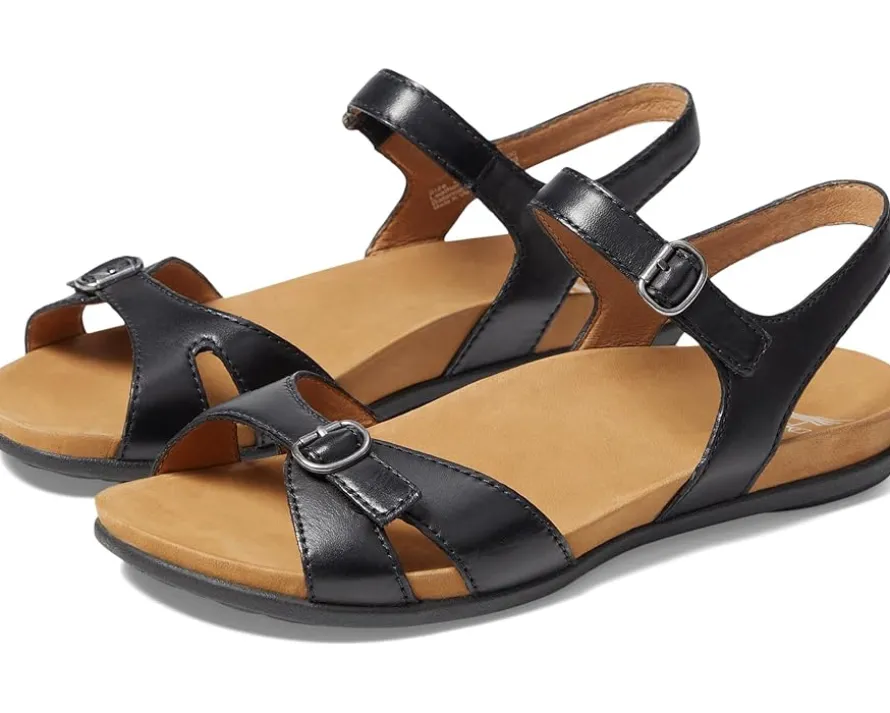 - Pop up your outdoor style with the comfort dimension of Dansko® Judith Flat Sandals. The almond toe pair features calf leather upper construction with buckle embellished hook-and-loop ankle strap closure.