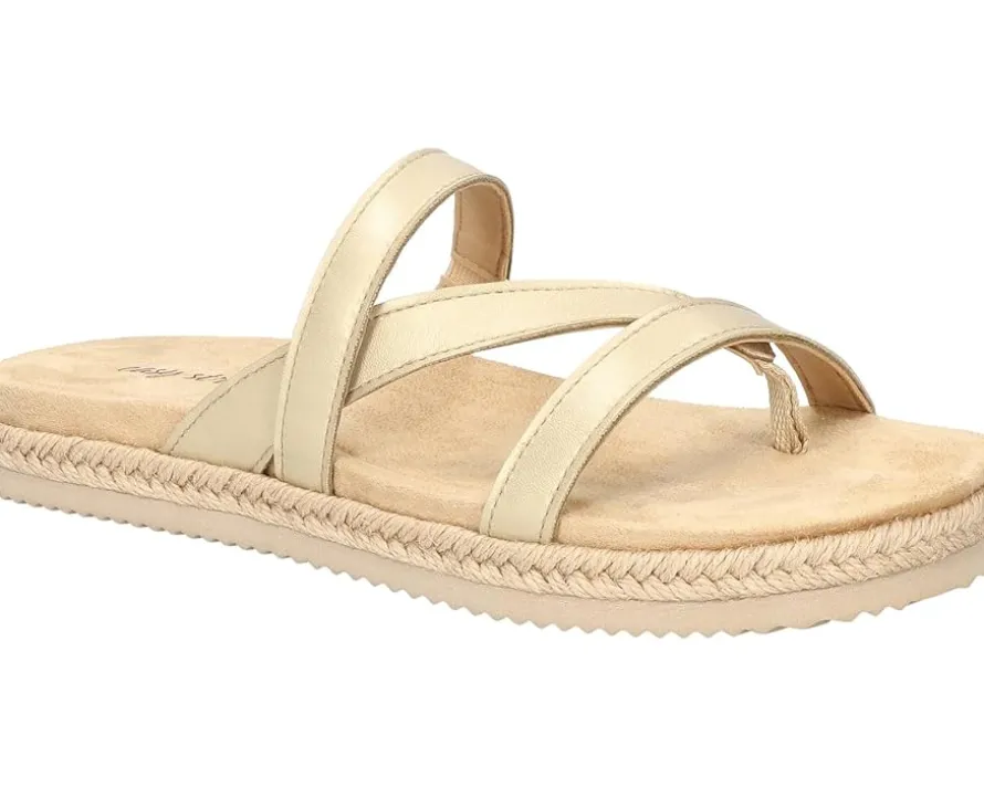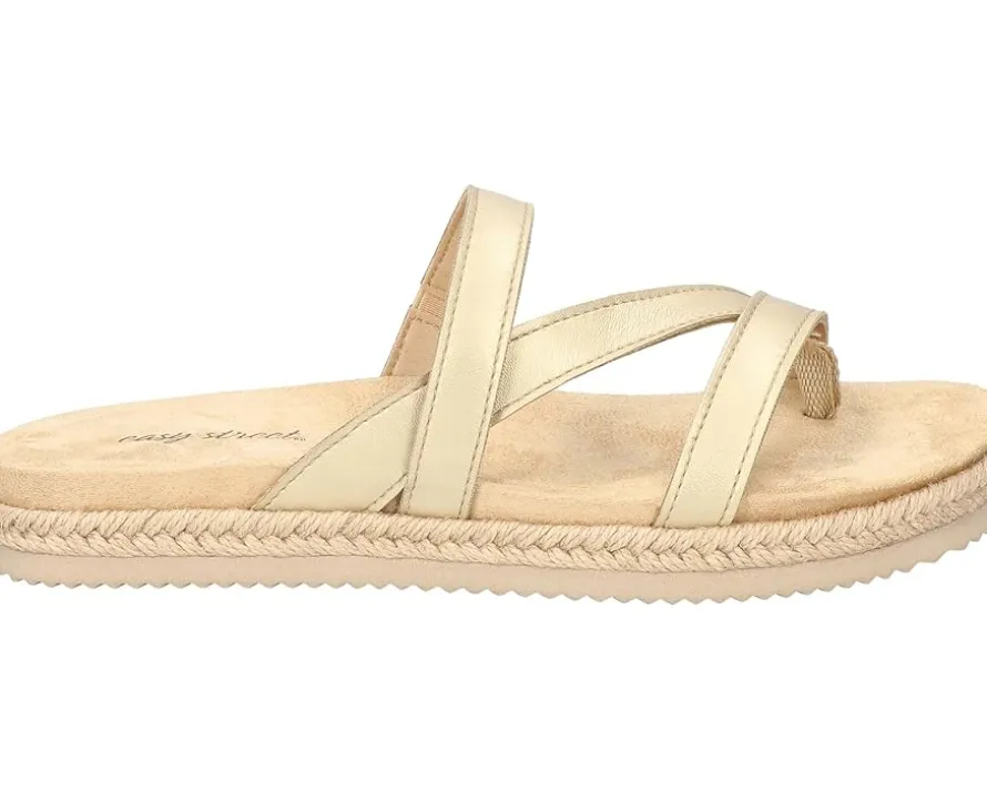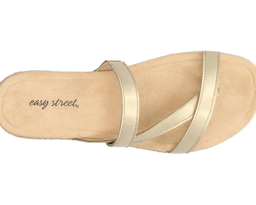 - Feel the difference with an enhanced level of comfort as you wear Easy Street® Song Flat Sandals. The slip-on footwear features multi-strip faux leather upper and lining construction with faux suede padded insole.