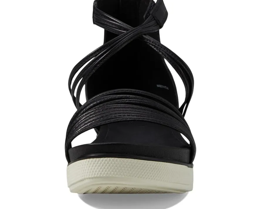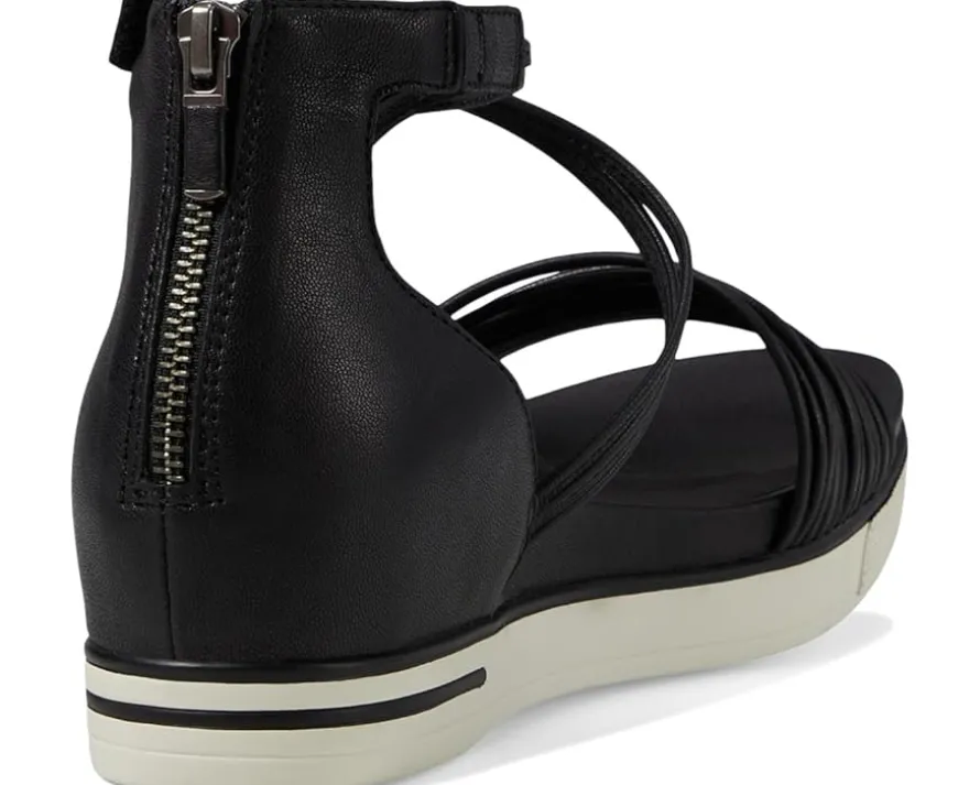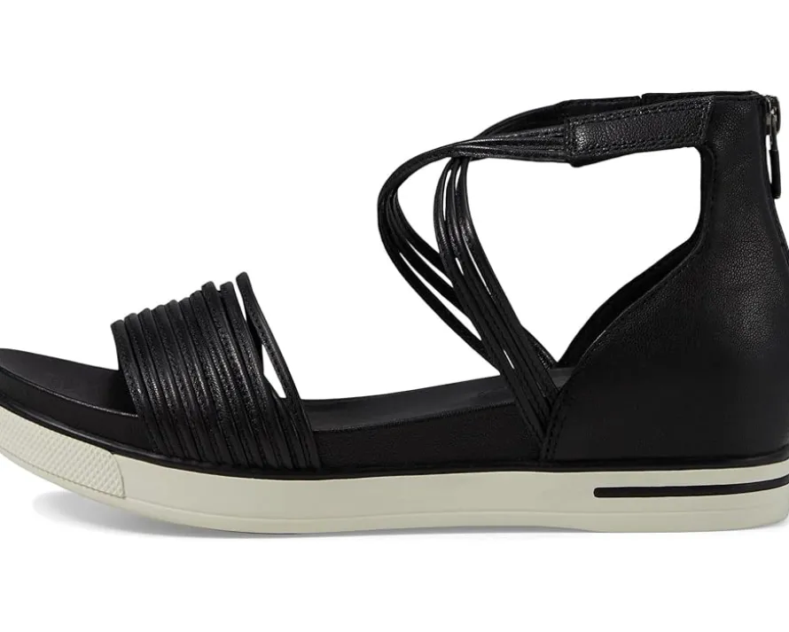 - Keep going through the streets wearing Eileen Fisher® Shea footwear. It features leather upper, breathable leather lining, and molded footbed for comfort. A multi-band design with crossing ankle strap has a hook-and-loop strap to adjust the fit. A back zip for ease to get the sandal on and off.