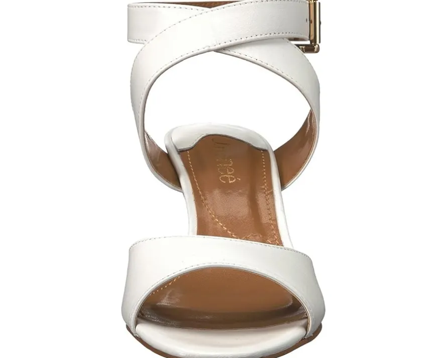 - Available in multiple materials with an open toe and wrap-around straps at ankle.