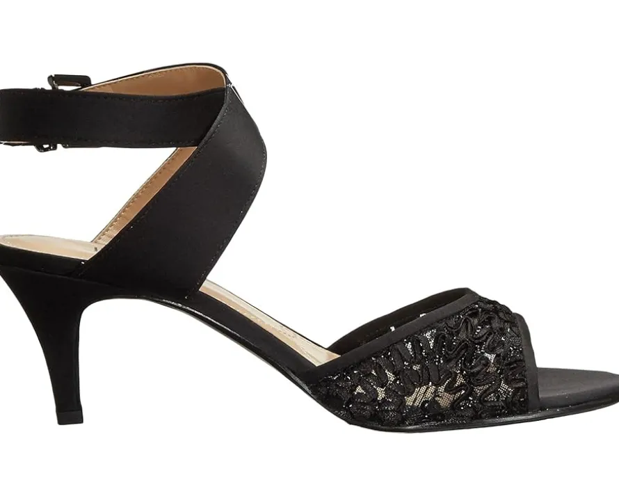 - Available in multiple materials with an open toe and wrap-around straps at ankle.