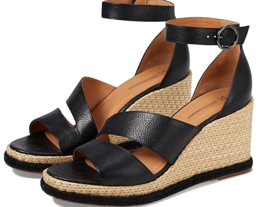 - Party in style and strut in glamor wearing the Johnston & Murphy® Marcia Asymmetrical Sandals. The wedge heels feature leather upper and lining construction with adjustable buckle closure along the ankle strap.