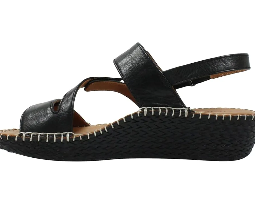 - Leather upper features slingback strap, a strap across the bridge, and two straps across the vamp. All adjustable for a comfort fit.