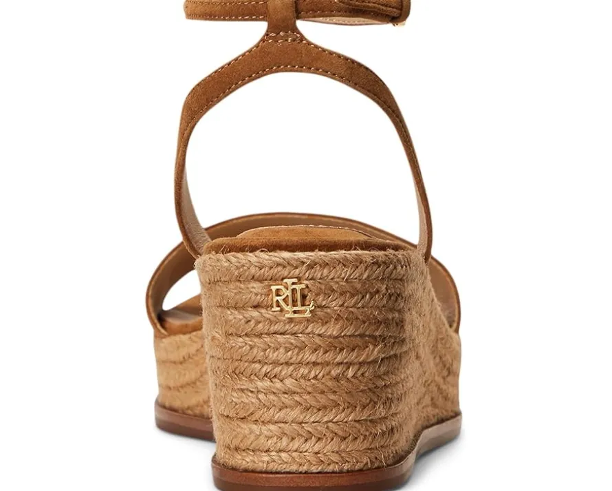 - Walk light wearing the stylish and comfy LAUREN Ralph Lauren® Leona Suede Espadrille. Crafted from leather upper, this pair of open toe sandals features wedge heel, ankle strap buckled closure, and metal brand logo at the back of the heel.