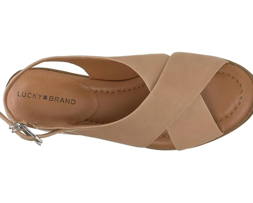 - Feel the extreme comfort wearing the Lucky Brand® Rhidlee. Crafted from leather upper, synthetic lining, and polyester insole, it features crisscross vamp strap detailing, buckled closure, block heel, and round toe design.