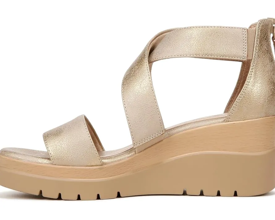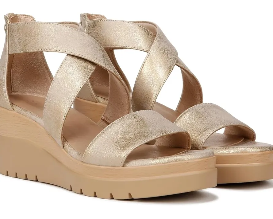 - Get ready for the date by wearing Naturalizer® Goodtimes sandals. They have a manmade or fabric/manmade upper with an open toe, soft foam lining, and arch support with memory foam socklining. They feature layered wedge heel and crisscross straps with back zip closure.