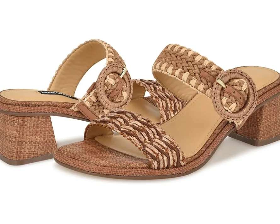 - Slip into sophistication with Nine West® Emerey sandals. Featuring an open square toe and chic woven straps, these sandals offer a blend of style and comfort. The buckle detail on the foot strap adds a touch of refinement, while the mid block heel provides just the right amount of lift for all-day wear.