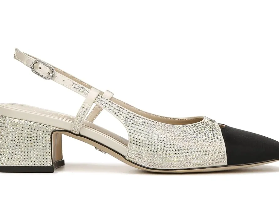 - Slingback strap with adjustable buckle closure.