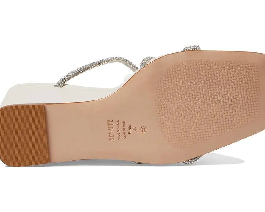 - LINING DESCRIPTION: Polyvinyl Chloride; WATER RESISTANCE LEVEL: Not Water Resistant; PRODUCT DESCRIPTION: Schutz Lauryn Wedge sandal with crystals ; SOLE MATERIAL: Leather; CLOSURE TYPE: Slip On; HEEL HEIGHT: 3.5; HEEL HEIGHT UNIT: Inches; HEEL TYPE: Wedge; INSOLE MATERIAL: Foam; ITEM WEIGHT SINGLE SHOE: 0.5; ITEM WEIGHT UNIT: Grams; OUTER MATERIAL: Polyvinyl Chloride
