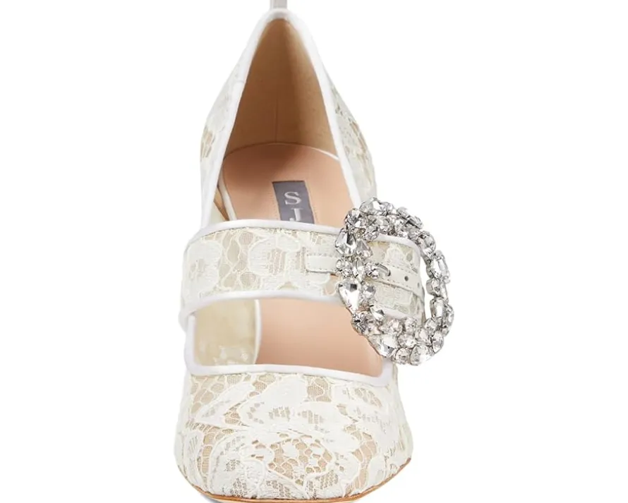 - Fabricated SJP by Sarah Jessica Parker™ Almond-toe pumps in a slip-on style with rhinestone encrusted buckle closure.
