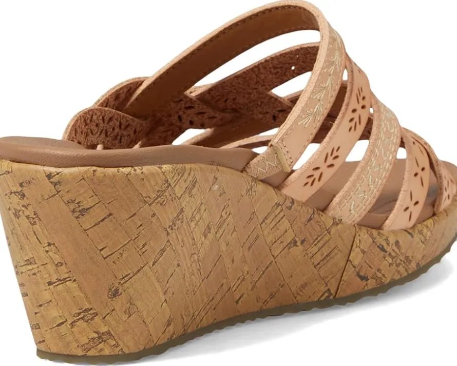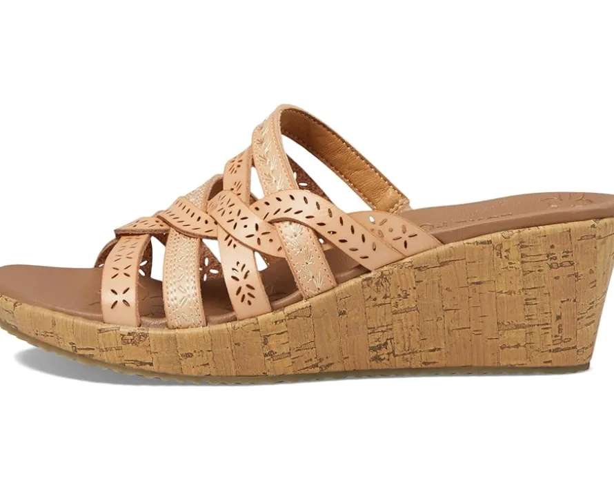 - Take your casual style to new heights by complementing outfits with the slip-on style SKECHERS® Beverlee – New Resort Heels in a sleek design with solid wedge heel. The heels are crafted with vegan materials including a duraleather upper, luxe foam® cushioned comfort footbed, and EVA midsole with a faux cork wrap. The strappy detailing with intricate cut-outs elevate the overall look.