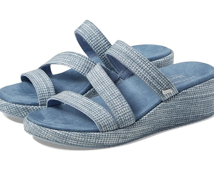- Say yes to both style and comfort by opting for the uber-chic SKECHERS® Martha Stewart – Arch Fit Beverlee- Morning Side Sandals embellished with a strappy upper. The slip-on style sandals are crafted with a breathable fabric lining, arch fit footbed, and shock-absorbing midsole with a platform wedge heel.