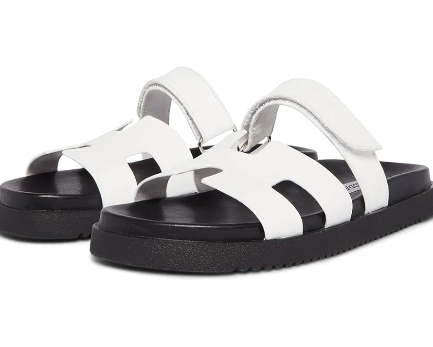 - The leather Steve Madden® MAYVEN slides feature comfy construction details like a molded footbed, a treaded flatform sole, and an adjustable top strap, plus a front strap with a geometric cutout design.