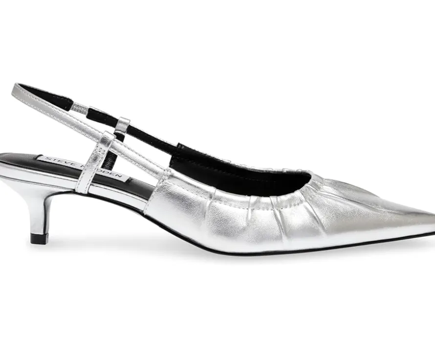 - Make every fashion moment an eye-catching evolution of style as you wear the Steve Madden® Syrie Pumps. The pointed toe pair features leather upper construction and an easy pull-on style with slingback strap closure. With a low-top silhouette, the pair has gathered pleats around the toe and open sides for a modern appeal.