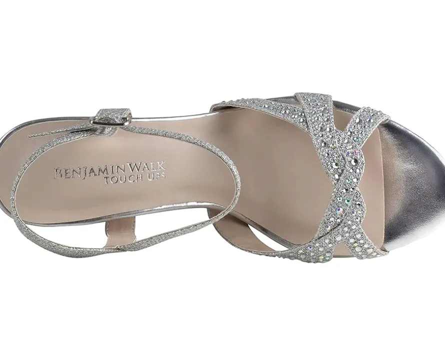 - Crisscross straps on the vamp with rhinestone embellishments.