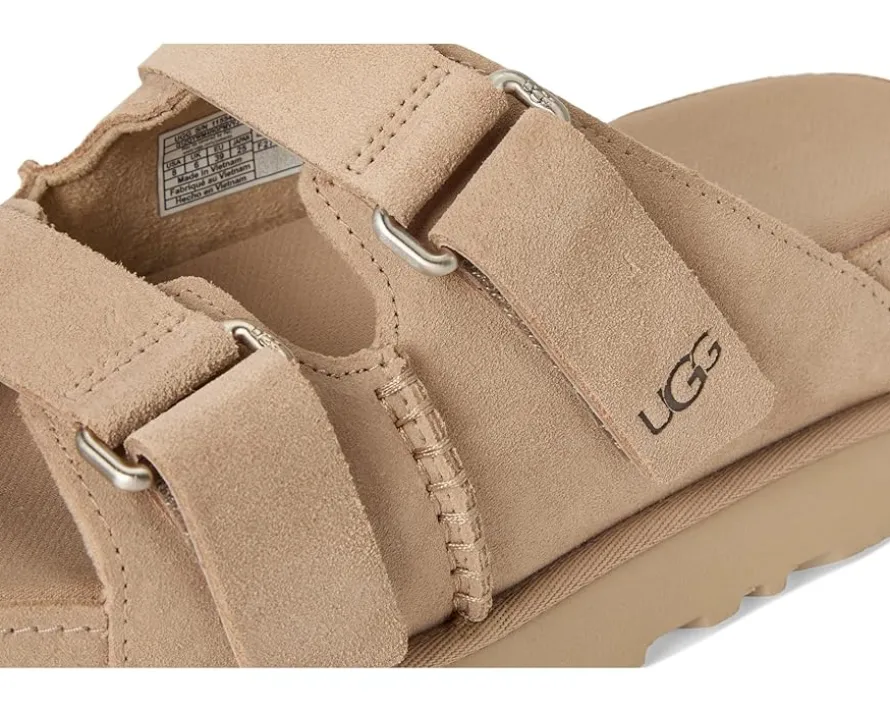 - Step up your shoe game by choosing the UGG® Goldenstar Hi Slide. Boasting a sleek and padded leather upper, these flat sandals offer a trendy look that effortlessly elevates any ensemble. The mesh lining offers a breathable experience and the dual-density foam footbed provides exceptional cushioning and support for all-day wearability. The adjustable vamp straps and convenient hook-and-loop closure allow you to always achieve the perfect fit.