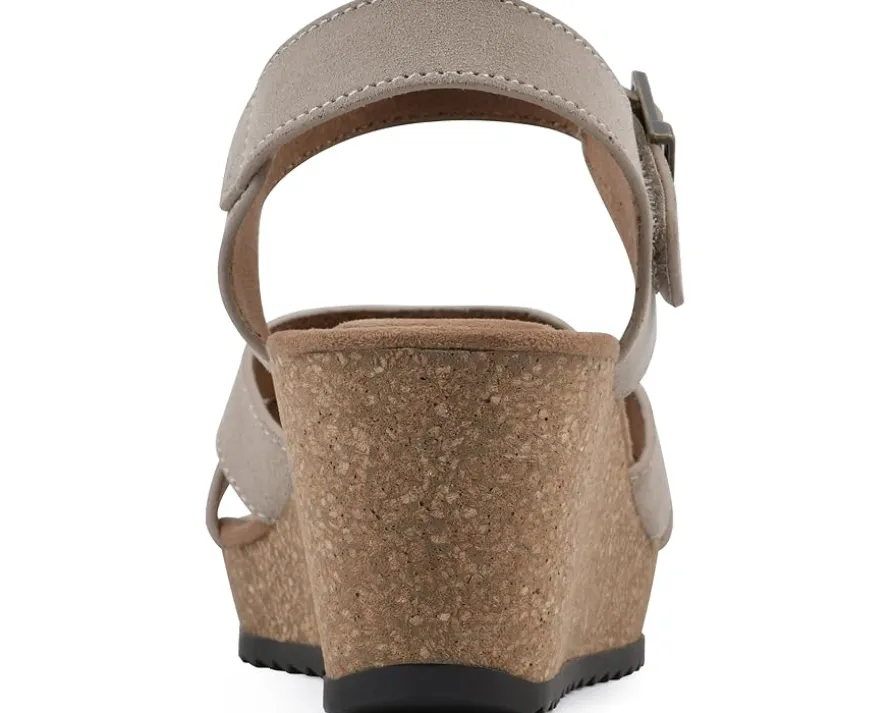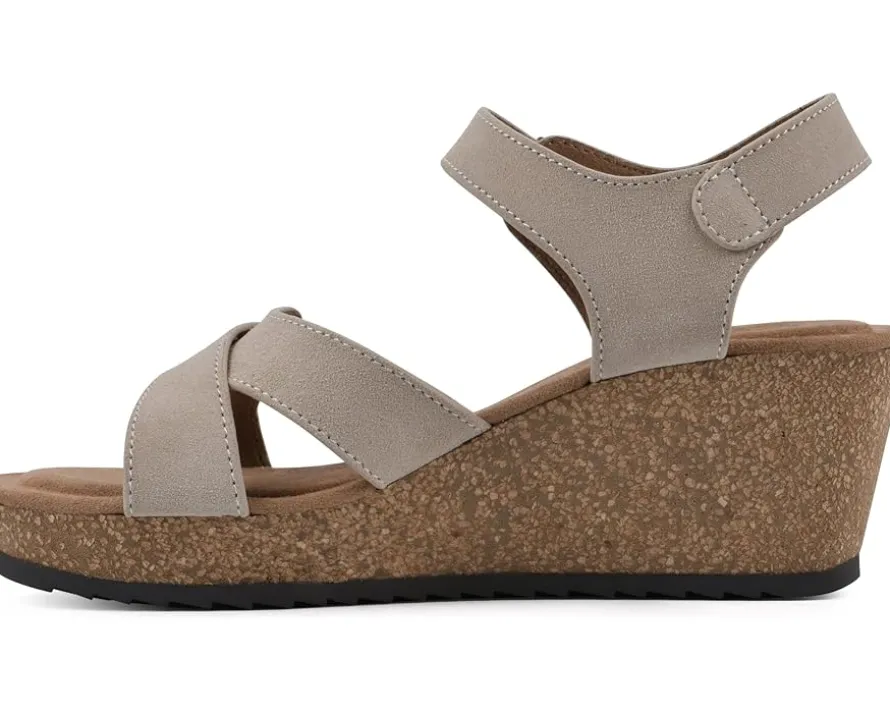 - Let comfort guide your journey as you wear the White Mountain® Prezo Sandals. The almond toe pair features leather upper with cross strap design, unlined construction, and adjustable hook-and-loop ankle strap closure.