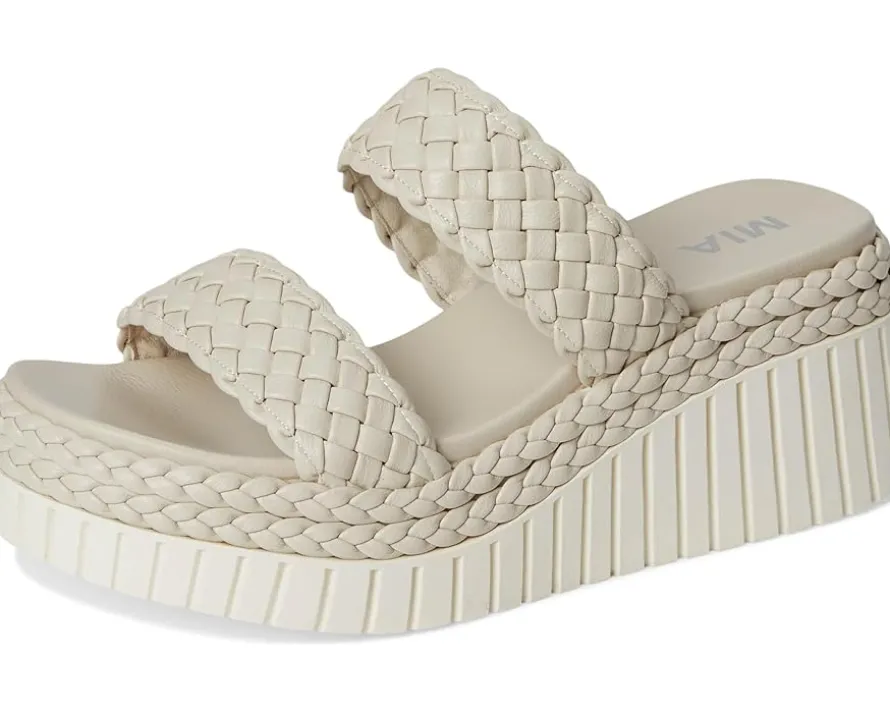 - Give your feet the comfort they deserve while still looking pretty in the MIA™ Yoshi Sandals. The open round-toe, slip-on style sandals are crafted with a faux leather upper with two braided straps. The faux leather lining and anatomical faux leather insole improves the comfort, while the wedge heel detail elevates the style statement.