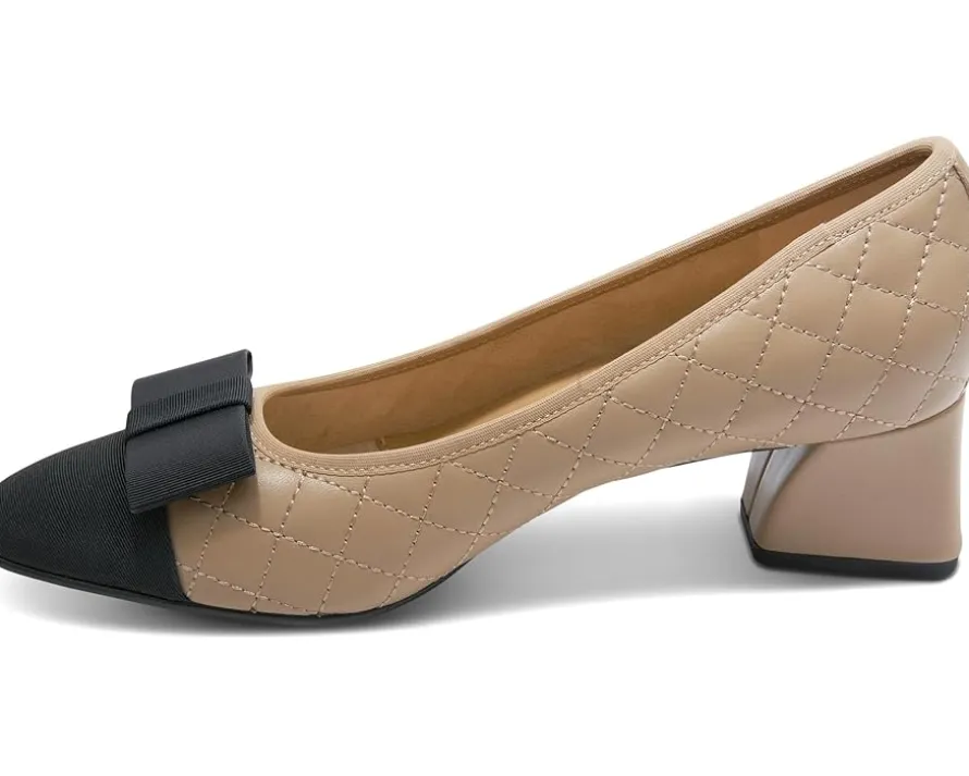 - A sculpting bow and diamond quilting pattern give the Vaneli® Zander Pumps a classic look. The slip-on footwear features leather upper construction with a block heel and almond toe silhouette.