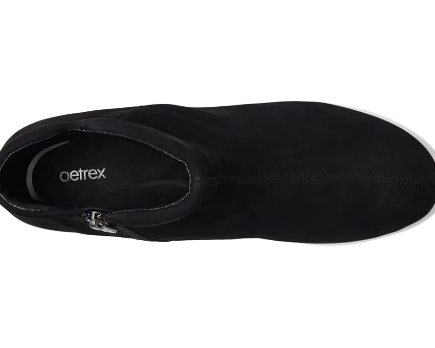 - Made for the Journey, Styled for the Spotlight, the Aetrex® Zoey is crafted from suede upper, polyester lining, and EVA insole. The Aetrex Orthotic System is built-In to every pair and features arch support that helps to stabilize your body, align your feet and relieve common foot pain. It comes with a closed round toe, mid-top silhouette, wedge heel, and zippered side closure.