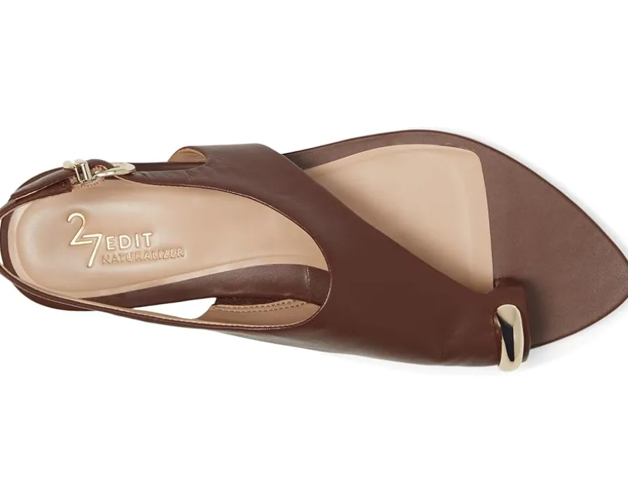 - From 27 Edit Naturalizer® found effortless elegance with a touch of shine. It’s the summer of sling backs. Slingback sandals with metallic touches and a toe loop. Premium leather upper responsibly sourced from leather working group certified tanneries, partially bio-based linings and an open toe. Adjustable buckle closure. Rezorb™ responsive cushioning for shock absorption + impact protection for sneaker-level comfort. Signature contour+ comfort technology for a true, all-day wear experience. Smooth lining and insole for natural comfort and breathability. Extra cushioning for added layer of unrivaled comfort. Proprietary rubber outsole design provides enhanced flexibility and shock absorption. Partially bio-based footbeds: crafted with soft and lightweight cushioning, built-in arch support, and a molded heel cup. Low heel, and insole crafted from partially recycled materials. Why you’ll love it: forever elegant silhouettes with all day wearability, designed to the contours of a woman’s foot.