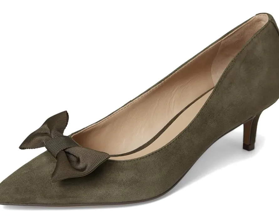 - Lauren Ralph Lauren® Adrienne Bow-Trim Suede Pumps bring sophistication and charm to every stride. Crafted from velvety suede, these pumps feature an ultrafeminine grosgrain bow at the vamp, instantly elevating your look with a touch of romance. The sleek leather upper and lining exude refinement, while the foam-padded insole provides all-day comfort you’ll love. Designed with a graceful kitten heel, these slip-on pumps offer just the right lift for effortless style without sacrificing ease. The durable leather outsole ensures stability and lasting wear, making them a versatile addition to your wardrobe. Finished with the signature “LRL” logo at the back, this pair embodies understated luxury with every detail.