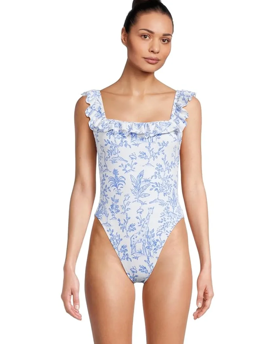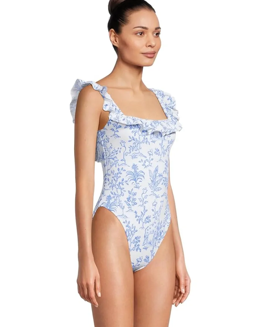 - Make waves in effortless elegance wearing the Lilly Pulitzer® Aemma Ruffle One-Piece-where timeless charm meets modern ease! This floral stunner brings a fresh, feminine vibe with its relaxed fit and sleeveless silhouette, perfect for sun-soaked days. The square neckline flatters beautifully, while delicate ruffle details on the straps and neckline add a playful, romantic touch. Designed for fuss-free styling, this pull-on one-piece offers all-day comfort without compromising on chic appeal.