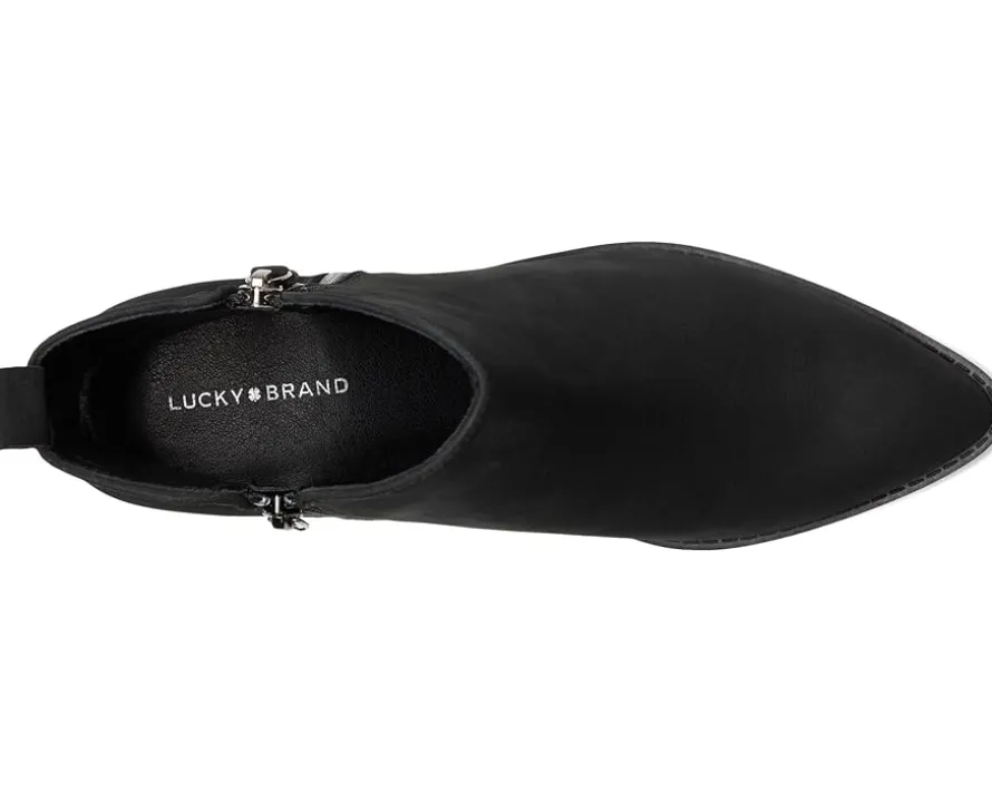 - The Ailein boot from Lucky Brand® is an effortless option for any fall look. This bootie features a pointed toe design, a stack heel, and a zippered side closure. Designed with a sleek leather upper and polyurethane lining, this bootie blends comfort and style with ease.