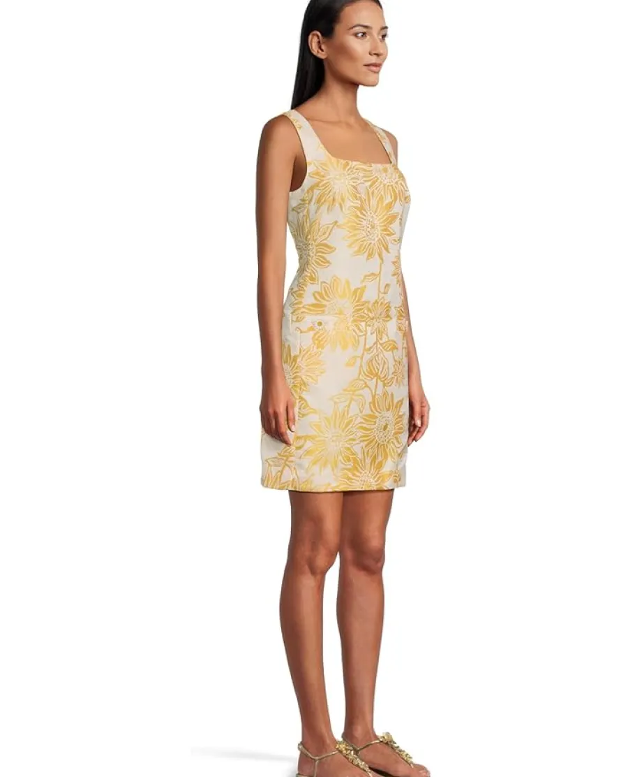 - The Lilly Pulitzer® Albright Shift is a straight-fit silhouette featuring a square neckline, side panel detailing, and two front welt pockets with buttons for a polished finish. The center back zipper offers a flattering yet secure fit.