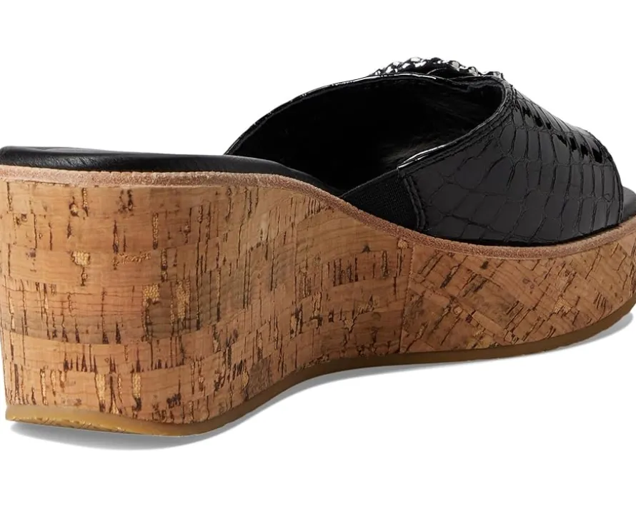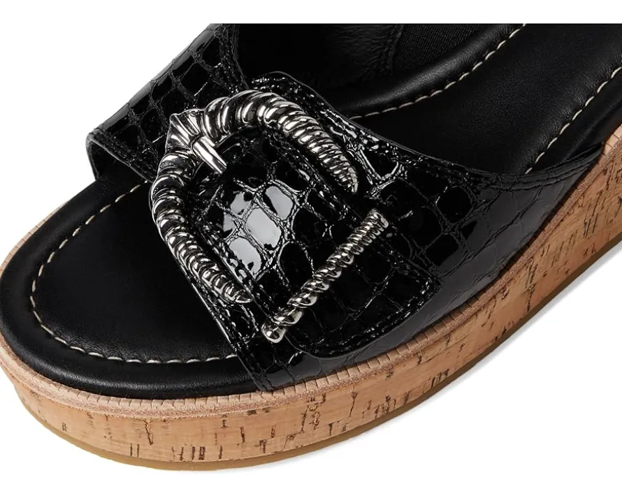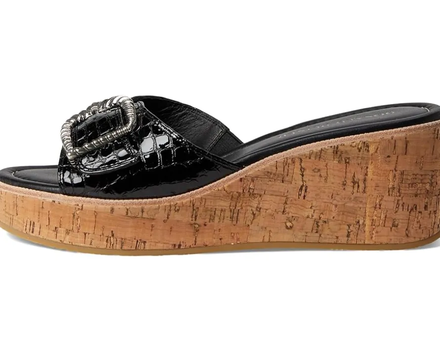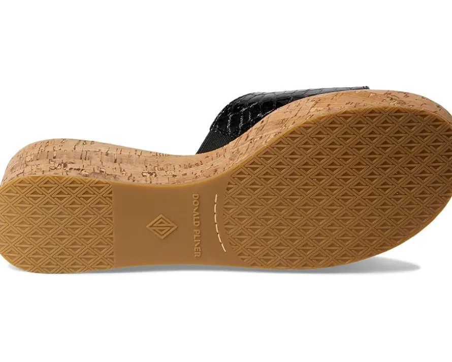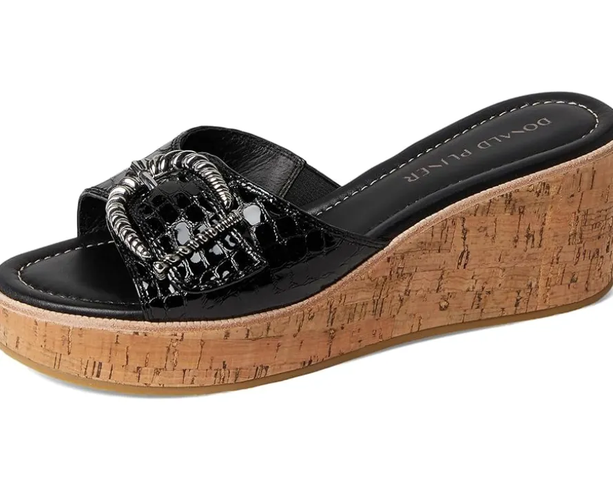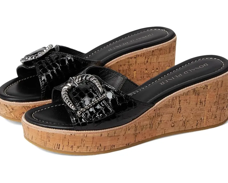 - The Donald Pliner® Alfee slip-on wedge combines style and comfort. Its croco patent leather upper is enhanced with a vintage-inspired buckle, adding to its charm. With its stylish design, comfortable fit and durable construction, this sandal is sure to become a staple in your footwear collection. Finished with a memory foam padded insole that cushions your foot with every step and a non-slip rubber outsole.