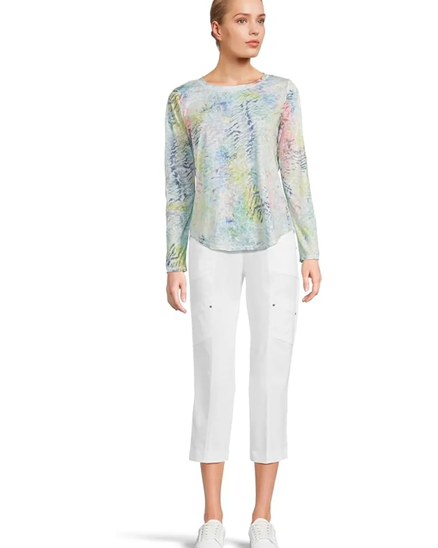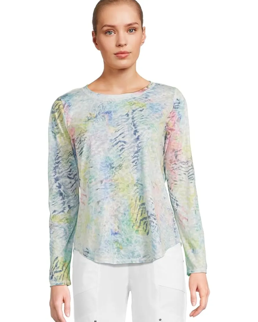- The Elliott Lauren™ Ambrosia Top brings a touch of artistic flair to your everyday wardrobe. Featuring a dreamy abstract graffiti print, this relaxed-fit style is designed for comfort with just the right amount of edge. It’s finished with a classic crew neck, long sleeves, and a curved hem with raw edges for a laid-back vibe. Top stitch detailing adds subtle texture, making this an effortless piece to pair with your favorite denim or casual trousers.