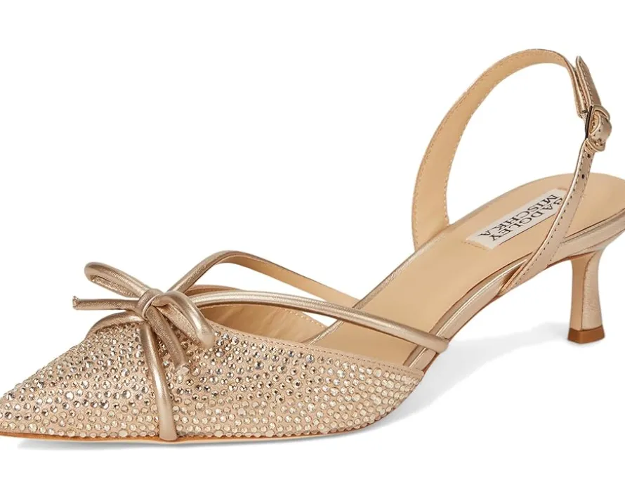 - Made of a silk upper with rhinestone and knot detailing, the Badgley Mischka® Angelina heels are perfect to style up your looks and outfits. The leather insole and breathable leather lining offer long-lasting durability and comfort. These heeled sandals feature an adjustable ankle strap for a secure fit. Get ready for a party or event wearing these leather pumps.
