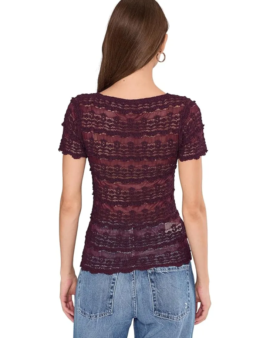 - Sweet and delicate, the Free People™ Angelina Lace Tee is a perfect addition to your chic wardrobe styling. Featuring a crew neckline with short sleeves, lace and mesh fabrication, and a scalloped hemline.