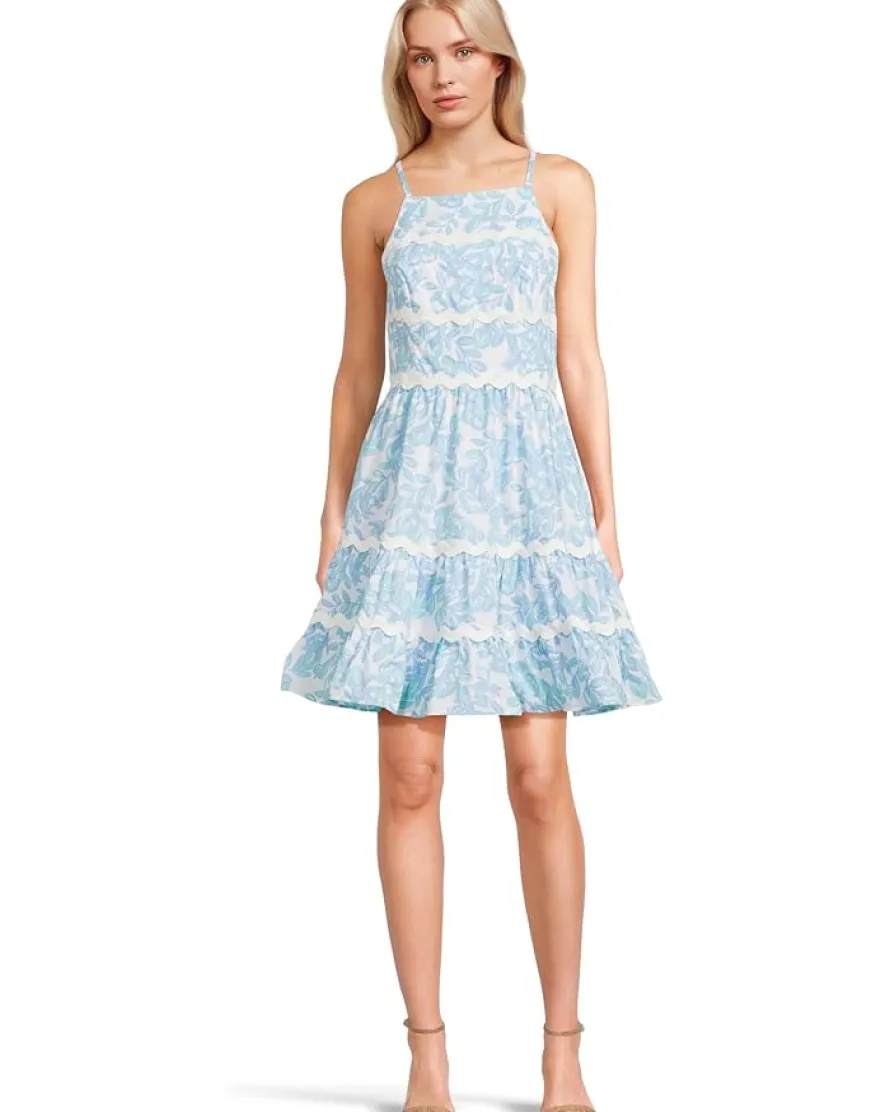 - Exude pretty vibes wearing Lilly Pulitzer® Angelynn Dress, adorned with an allover floral print. The fit-and-flare dress features an apron neckline, sleek shoulder straps, bodice cups, tiered skirt, half-zipper closure, side seam pockets, and ric rac trim. It is intended to fall slightly above the knees.