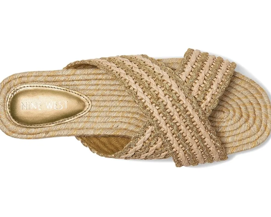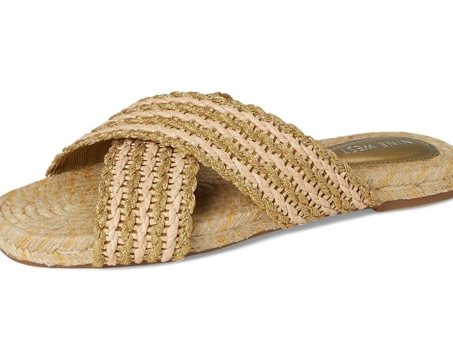- Step up your shoe game in the Nine West® Animay casual sandals. These slip-on sandals are made of a polyurethane upper, cushioned insole, and cotton lining. They feature a slip-on silhouette, criss-cross straps, and a round-shaped toe. These slide sandals are anything but boring.