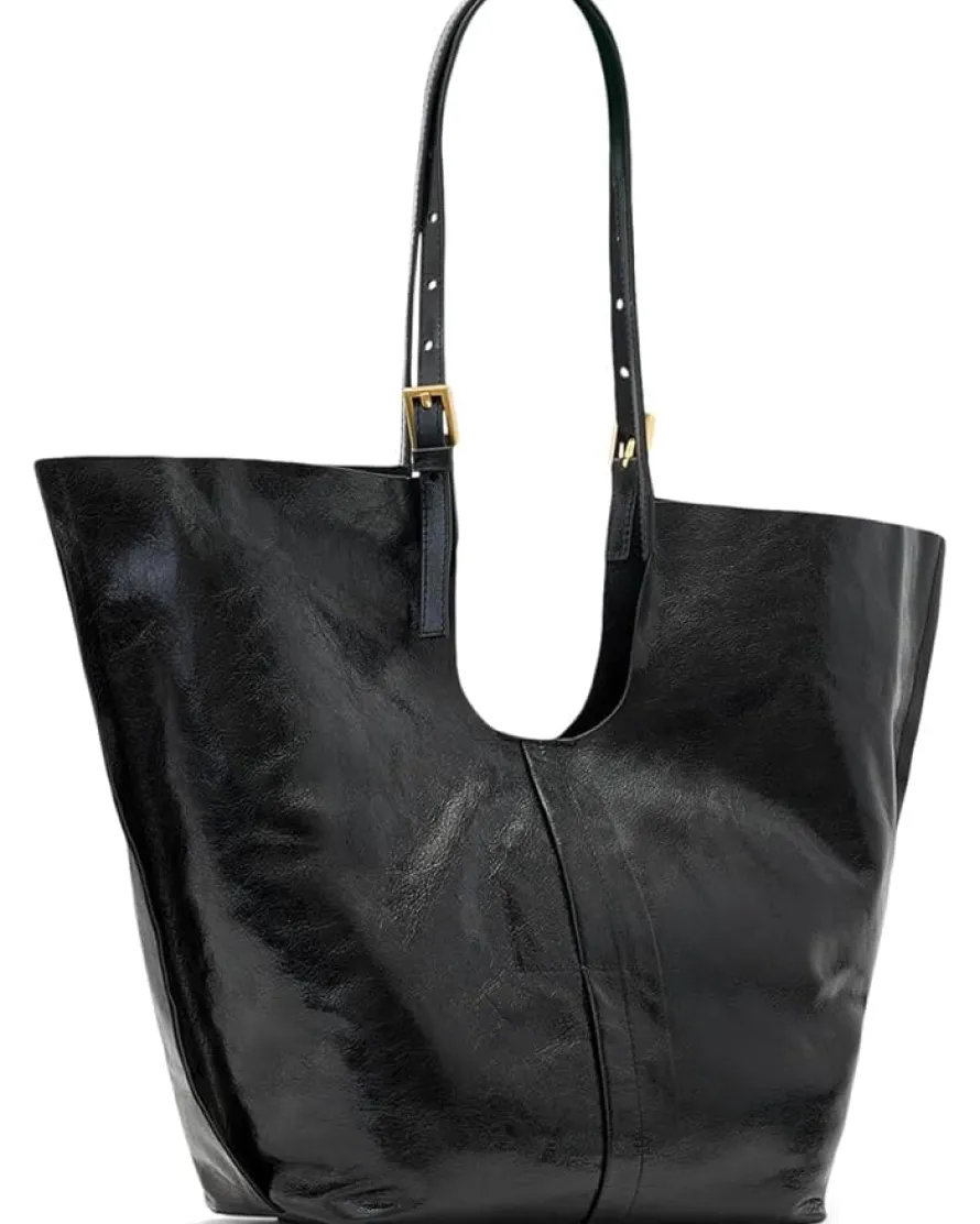 - The AllSaints™ Ara Shine East/West Tote is shaped from leather with enough room for all of your on-duty essentials. The cutout armhole means it can fit under your arm with ease and the straps are adjustable too.