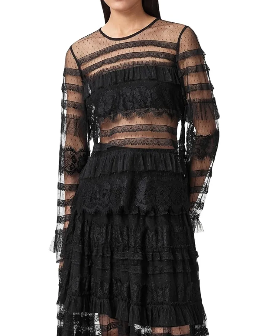 - Beautiful mesh details, lace trim, and frills make this pull-on style AllSaints™ Arlea Tulle Top a perfect match for your party-wear looks. The top features a crew neck, long sleeves, and a back-button closure.