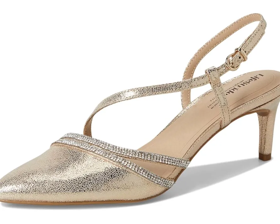 - LifeStride® Arlo2: Experience the perfect blend of elegance and effortless grace. These chic, sparkly slingback pumps are designed to elevate your look while keeping you comfortable all day long. Featuring a contemporary asymmetrical design with rhinestone accents, faux leather construction, and a softly pointed toe, these pumps are perfect for any occasion. The adjustable buckle closure and built-in stretch ensure a secure, customized fit, while the synthetic rubber lining and outsole offer durability. The EVA insole provides cushioned support, enhanced by Soft System® comfort technology for flexibility and comfort with every step. Plus, the traction sole offers added stability, making these pumps as practical as they are stylish. Crafted with partially recycled materials, LifeStride Arlo2 pumps are the eco-friendly choice for the modern woman.