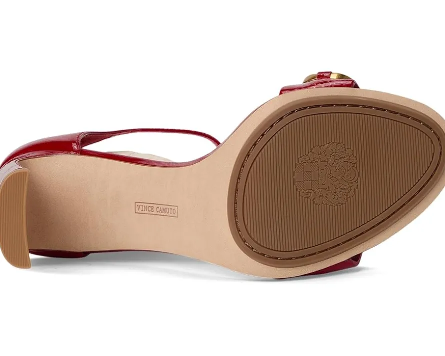 - These glamorous and sophisticated Vince Camuto® Aurelia Chain Link High Heel Sandals are available in a variety of finishes- patent, metallic, croc, and leopard. The sleek, open-toe design is elevated by a bold gold chain embellishment on the front strap, adding a touch of luxe detail. A delicate ankle strap with a goldtone buckle closure ensures a secure and adjustable fit, while the high blade heel enhances the shoe’s elegant silhouette. Crafted from luxe leather upper, this sandal is perfect for special occasions, effortlessly complementing evening gowns, cocktail dresses, or chic tailored looks. A true statement piece for any wardrobe.