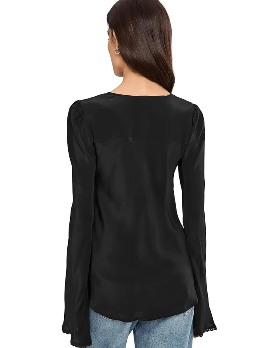 - The Free People™ Bali Ariel Top is your passport to effortlessly chic style, blending laid-back charm with a touch of sophistication. Designed with a flattering V-neckline and a feminine tie-front closure, this top flows beautifully in its satiny fabrication, catching the light with every move. The bell sleeves and embroidered scallop trim along the bust and cuffs add an artisanal touch that channels the serene spirit of island artistry. With its pull-on design and relaxed, flowy silhouette, it’s as comfortable as it is captivating, perfect for brunch dates, beach strolls, or sunset soirées.