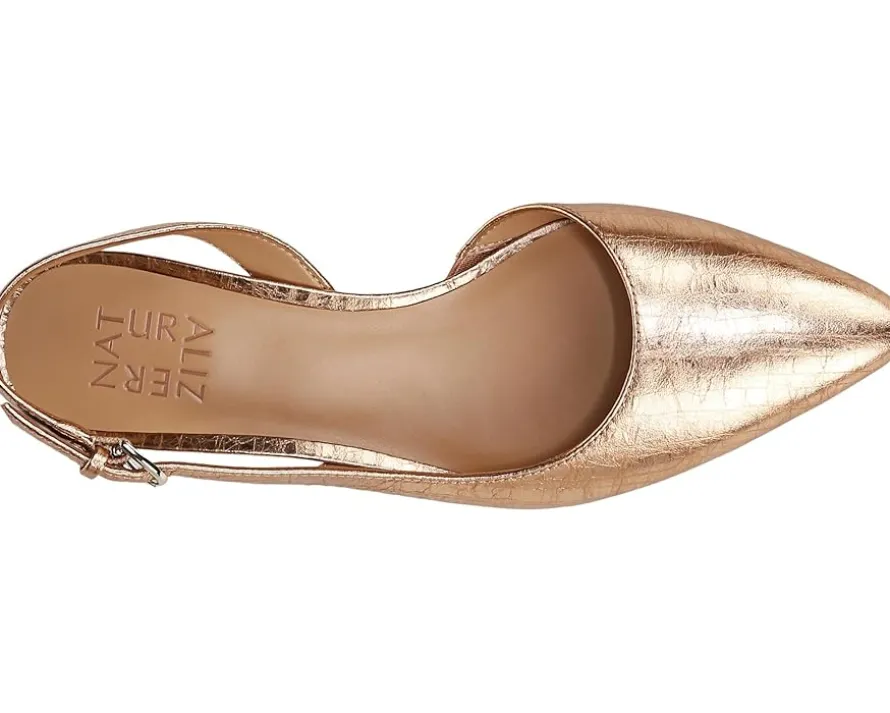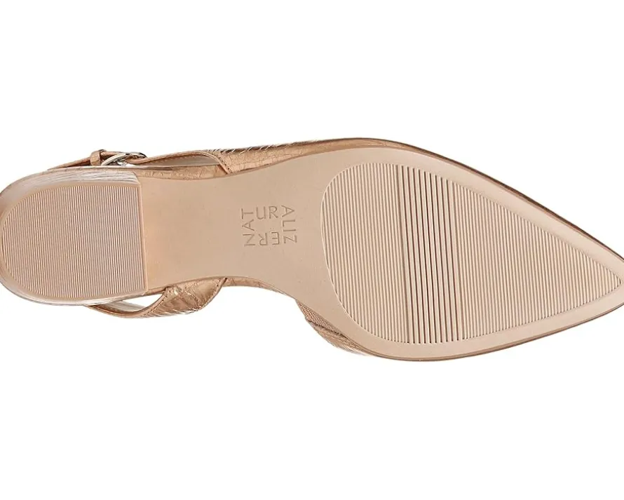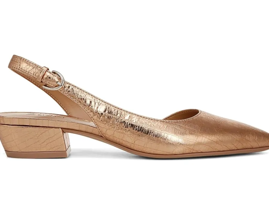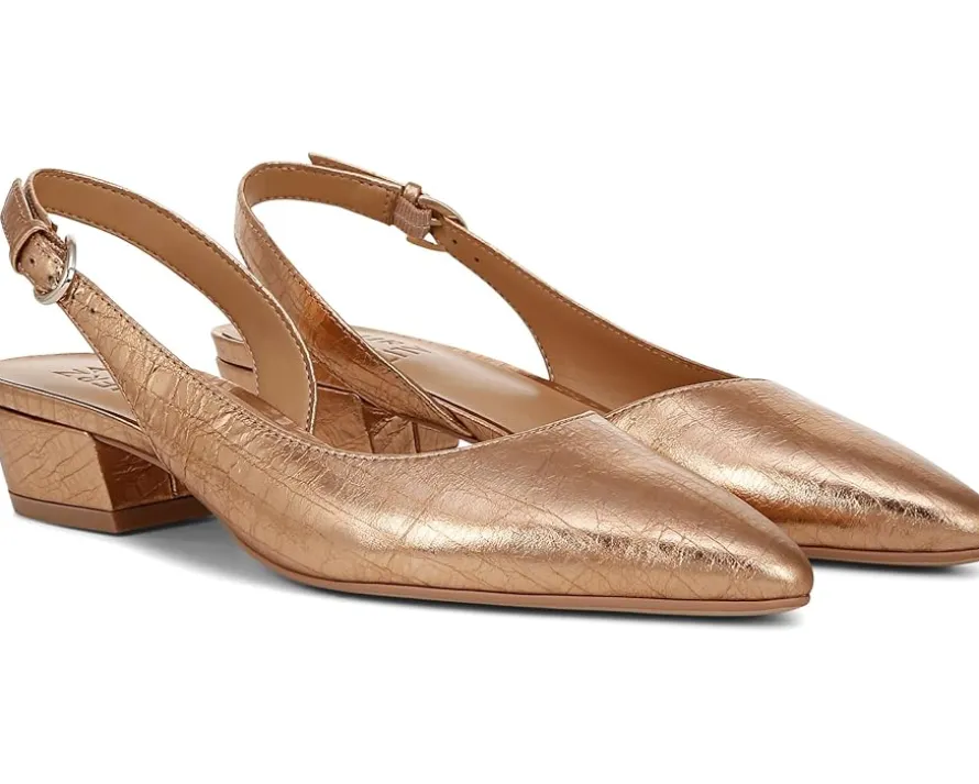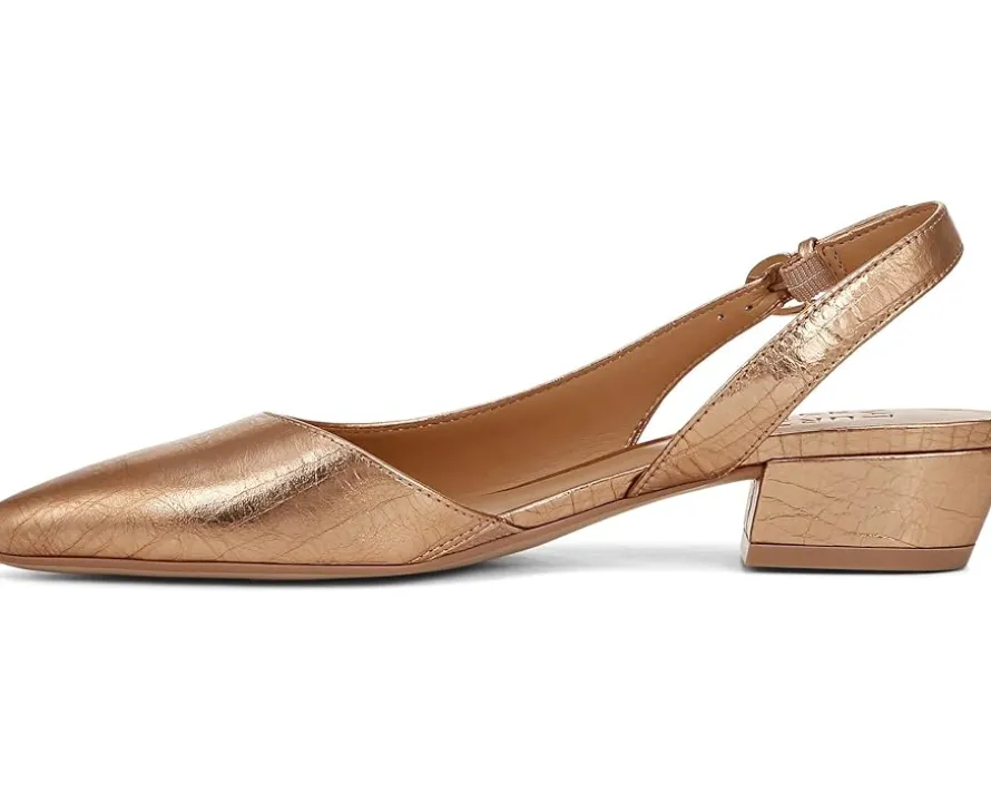 - Slingback strap with adjustable buckle closure.