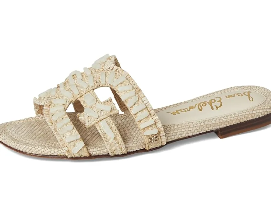 - The Sam Edelman® Bay Stone slides are warm-weather chic. Versatile and easy to match, they look great whether it’s a day at the pool or lunch with friends. These slide sandals are made of a polyurethane upper, leather insole, and polyurethane lining. Adorned with an iconic double “E” logo, these flat sandals can be worn with cutoff jeans or a simple, flowing sundress.
