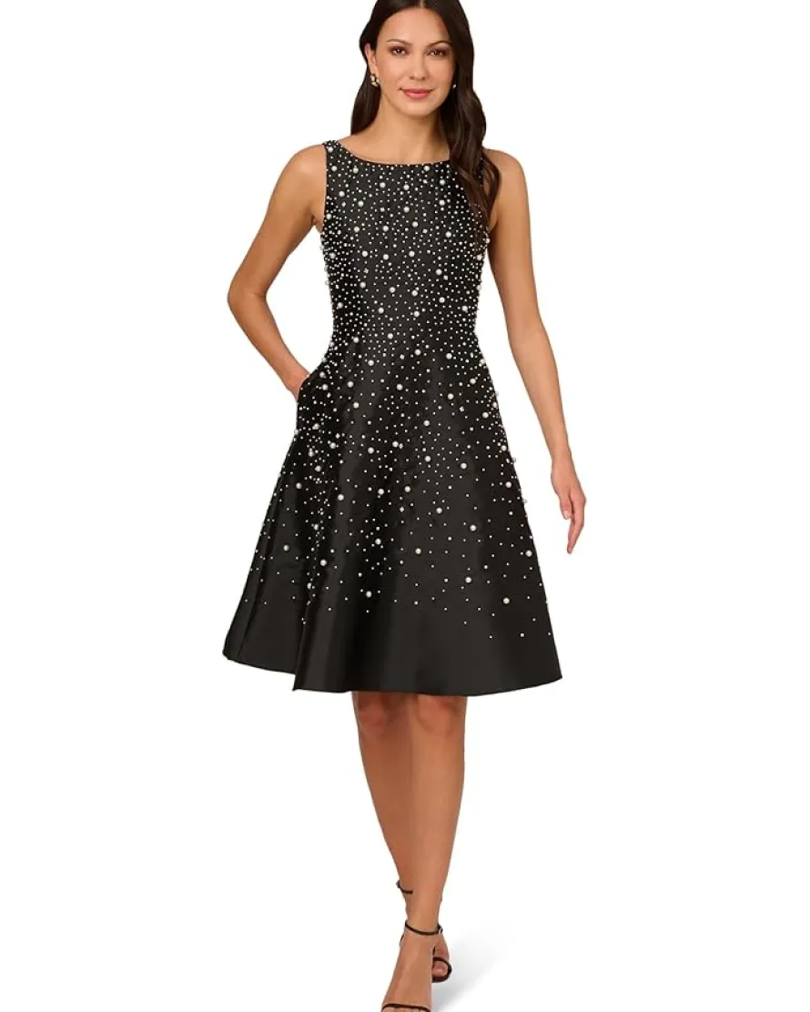 - Illuminate the night in the Adrianna Papell® Bead Taffeta Midi Dress, where intricate embroidery dances across the fabric like constellations. With a graceful boat neck and a flattering fit-and-flare silhouette, this sleeveless wonder captivates effortlessly. Zippered closure ensures ease, making it a stellar choice for any soirée.