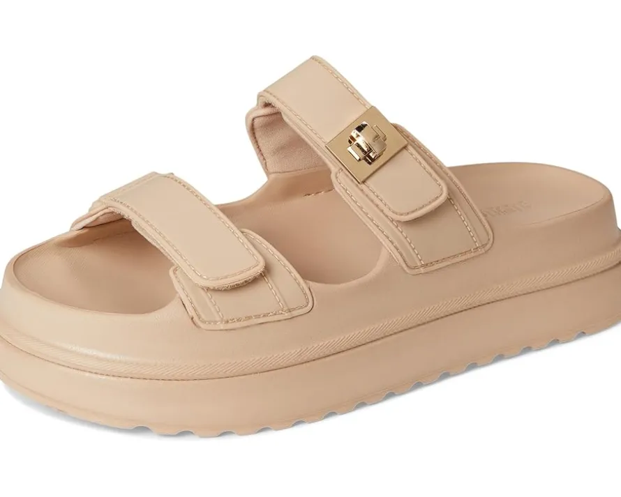 - Elevate your style donning the Steve Madden® Bigschmona platform slide sandal. The flatform design provides a modern twist while the turn-lock hardware accent adds a touch of sophistication. Step up your fashion game while enjoying the comfort and stability of this versatile shoe. The stylish flats have suede upper, synthetic rubber lining, and rubber insole.