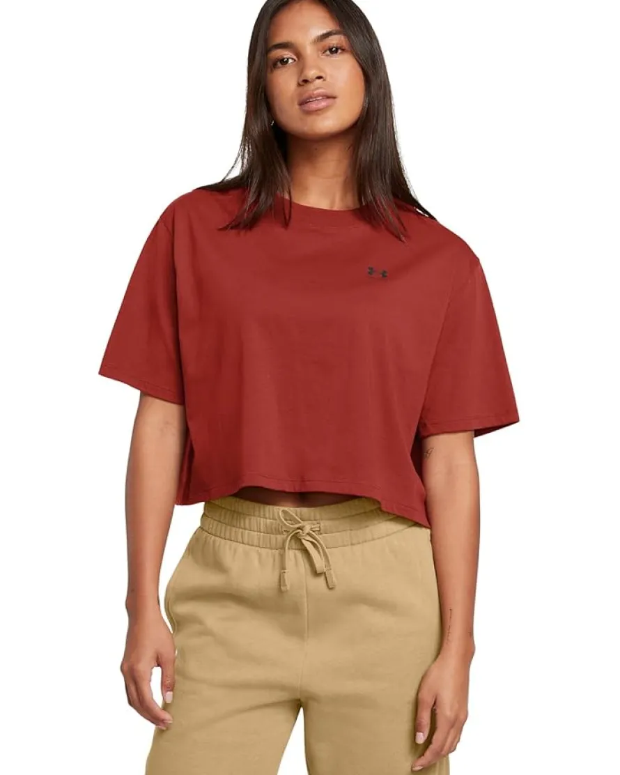 - Designed to match your everyday comfort and style, the Under Armour® Boxy Crop Logo Short Sleeve T-shirt is a great choice for matching your casual styles or lounging at home. The polyester fabric of the tee offers all-day comfort and durability. This plain T-shirt is styled with short sleeves, a crew neckline, and a straight hem. This cropped tee is perfect to pair with casual trousers and denim shorts.