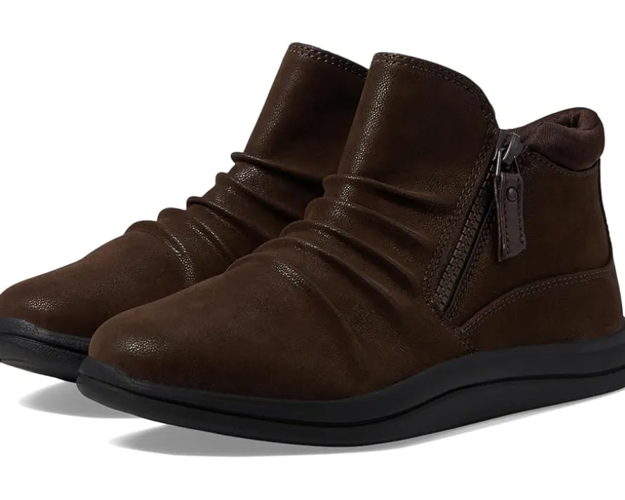 - Sleek and slouchy, the Clarks™ Breeze Range Boots are exclusively designed to give an instant boost to your street or dressy style without letting you give up comfort. The shoes feature an ankle-high silhouette with a closed round toe and are secured with a zippered closure for easy on and off. The synthetic upper displays a ruched detailing for added style while the Cushion Soft™ technology on the foam footbed ensures comfort with every step.