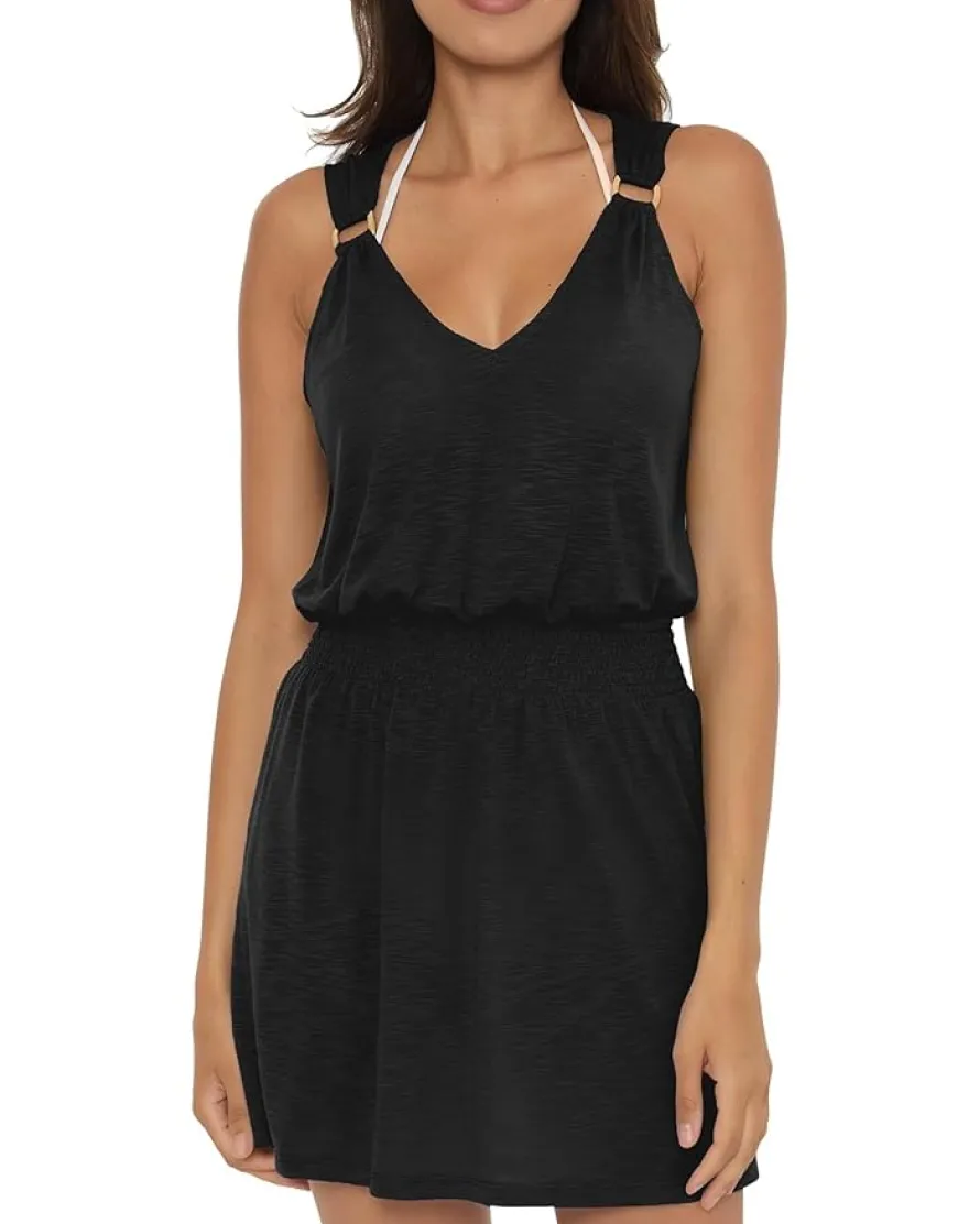 - Be on the fashion move any day wearing BECCA by Rebecca Virtue® Breezy Basics Square Buckle Plunge Neck Dress. It features a V-neckline with gold buckles along shoulder straps and smocked blouson waist.